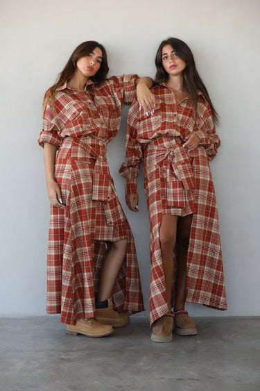 The Madison Red/Beige set captures oversized elegance in a warm tartan fabric with rich red and beige tones. Designed for the autumn-winter season, it includes an oversized shirt and a buttoned skirt, available in two lengths: short for a bold look, or long for a graceful silhouette. The shirt sleeves tie at the waist, creating a belt effect that shapes and structures the figure.