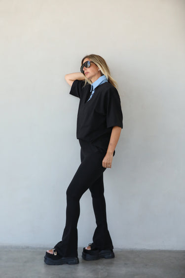 The Adele Set embodies N-SOF’s sport-chic DNA: an oversized polo with structured shoulders, hand-washed denim collar, and subtle chest embroidery, paired with flattering high-waisted leggings with a slight flare at the hem.
