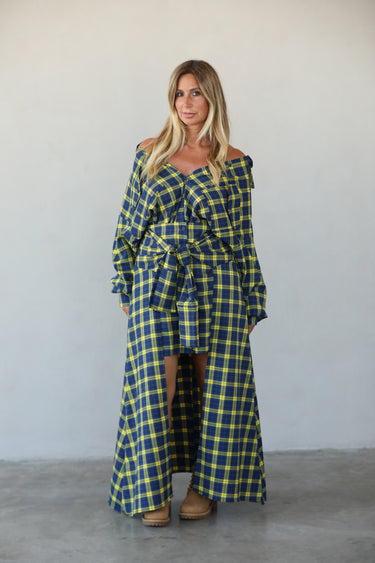 The Madison Blue/Yellow set reinvents oversized elegance with a warm and structured tartan fabric. Designed to offer both comfort and bold style, it combines an oversized shirt with a short buttoned skirt. The unique detail: the shirt sleeves tie around the waist, creating a graphic belt effect that highlights the silhouette.